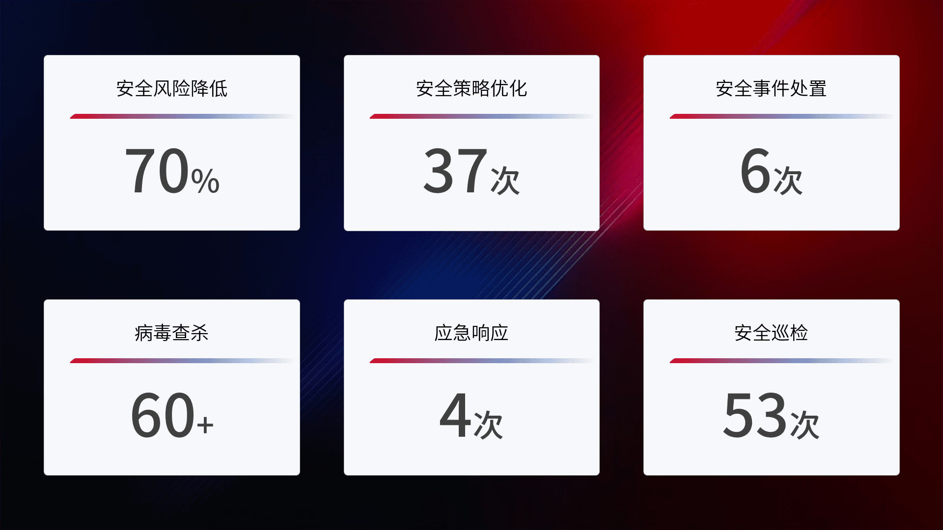 提供全面的安全事件报告体系,,,,包括处置报告、、、、周报、、、季度和年度总结,,,结合持续监控,,,帮助客户深入了解网络安全状况。。。。
